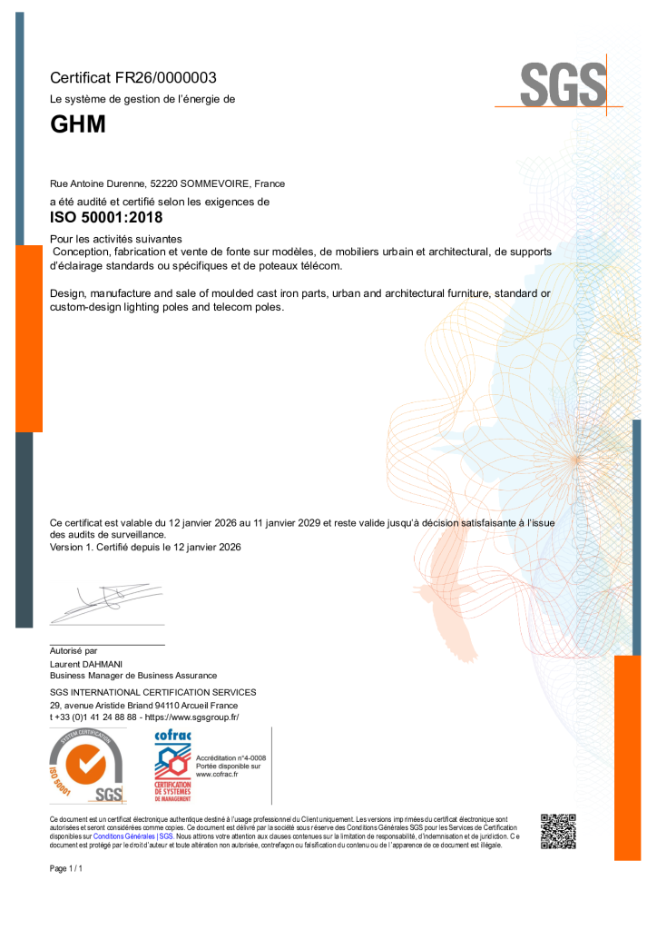 GHM est certifié depuis Janvier 2024. Actuellement ISO 14001 version 2015 par l’organisme SGS. Activités certifiées : Conception, fabrication et vente de fonte sur modèles, de mobiliers urbain et architectural, de support d’éclairage standards ou spécifiques et de poteaux télécom.